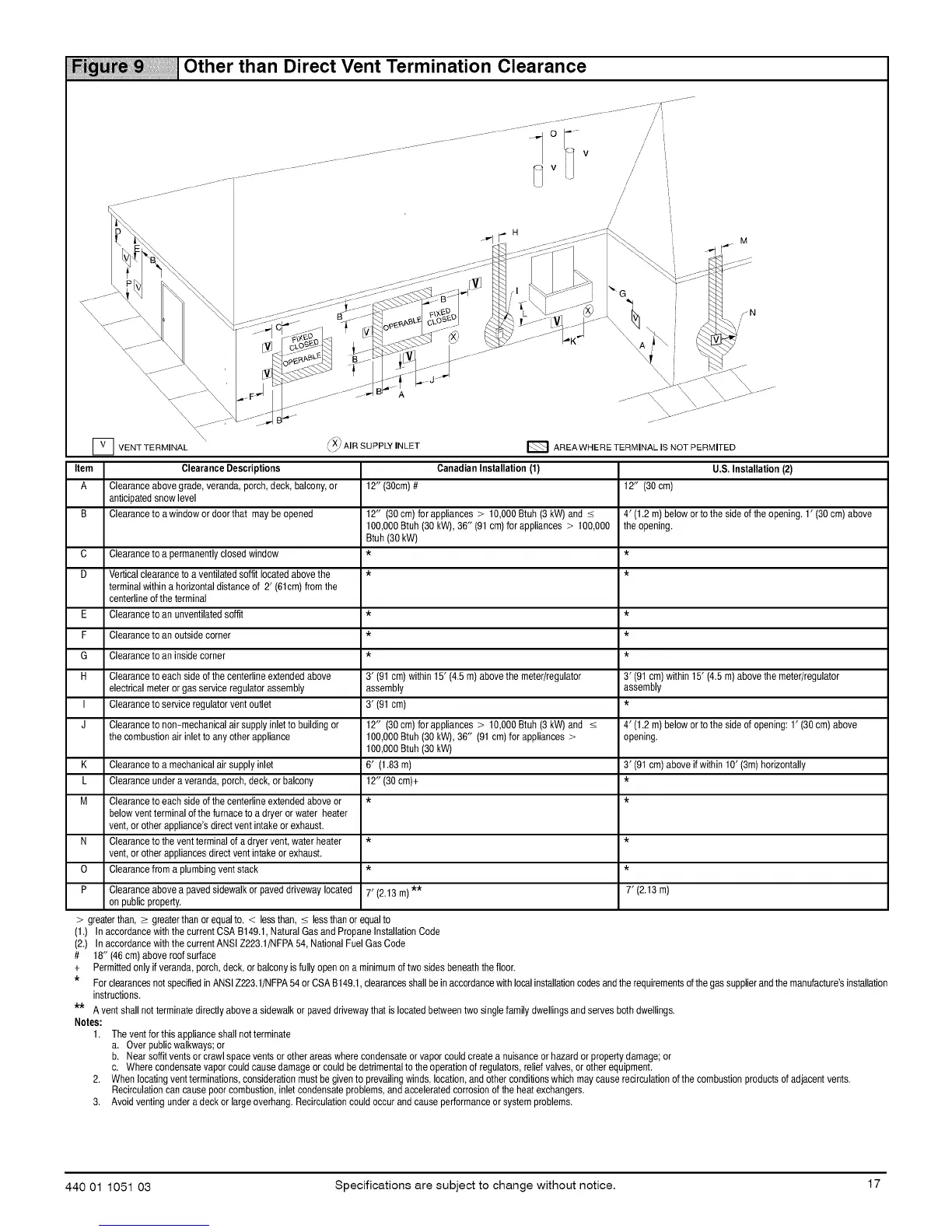 J Clearanceto non=mechanicalair supplyinlet to buildingor 12" (30cm) for appliances > 10,000Btuh (3kW) and < 4' (1.2 m)belowor tothe side of opening: 1' (30 cm)above