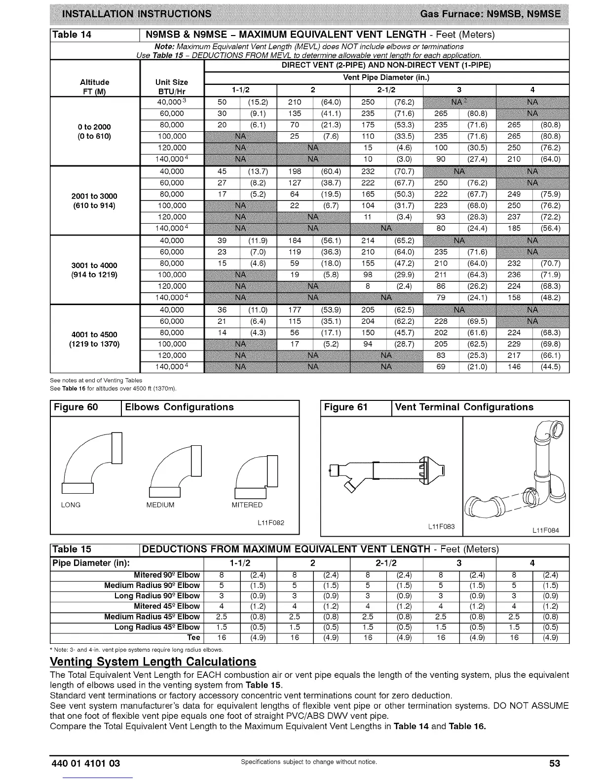 N9MSB & N9MSE - MAXIMUM EQUIVALENT VENT LENGTH - Feet (Meters)
