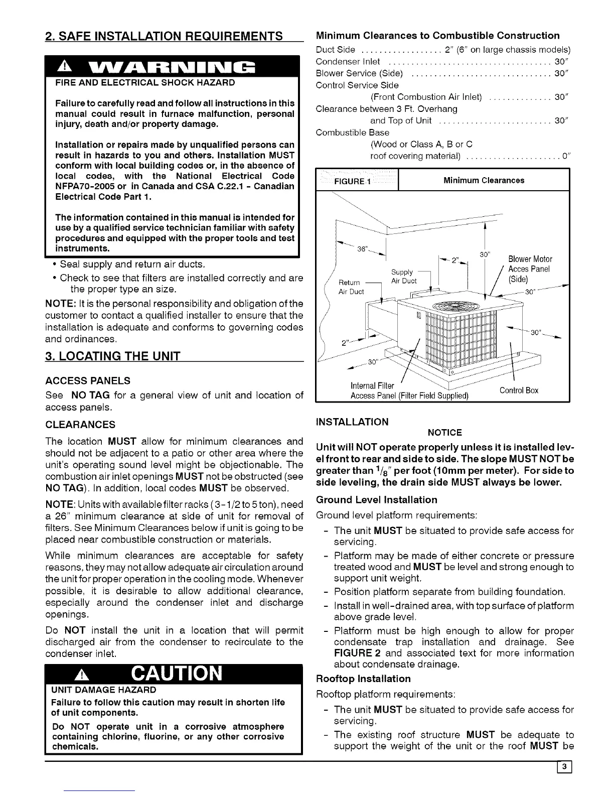 ICP PAF354000K00A1 - SAFE INSTALLATION REQUIREMENTS; Minimum Clearances to Combustible Construction; INSTALLATION; Ground Level Installation