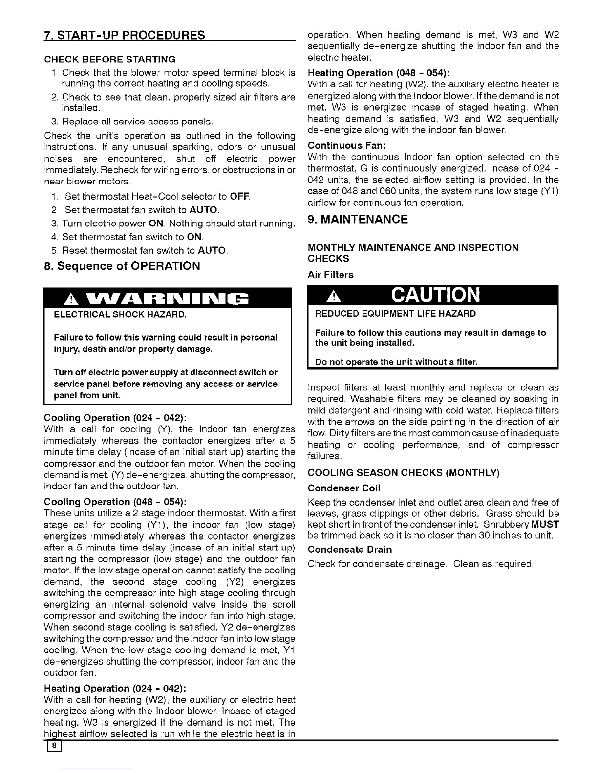 ICP PAF354000K00A1 - START-UP PROCEDURES; CHECK BEFORE STARTING; Sequence of Operation; Cooling Operation