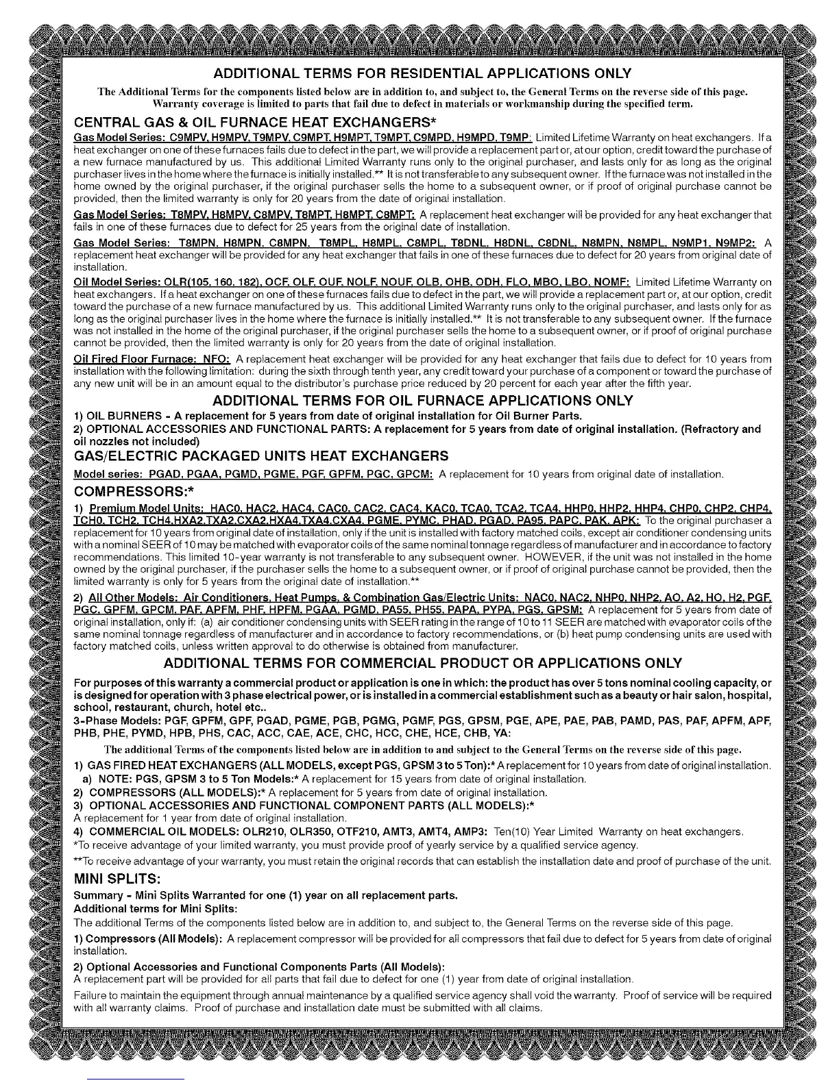 Gas Model Series: C9MPV, HgMPV, TgMPV, CgMPT, H9MPT_TgMPT, C9MPD, H9MPD, TgMP: Limited Lifetime Warranty on heat exchangers. If a