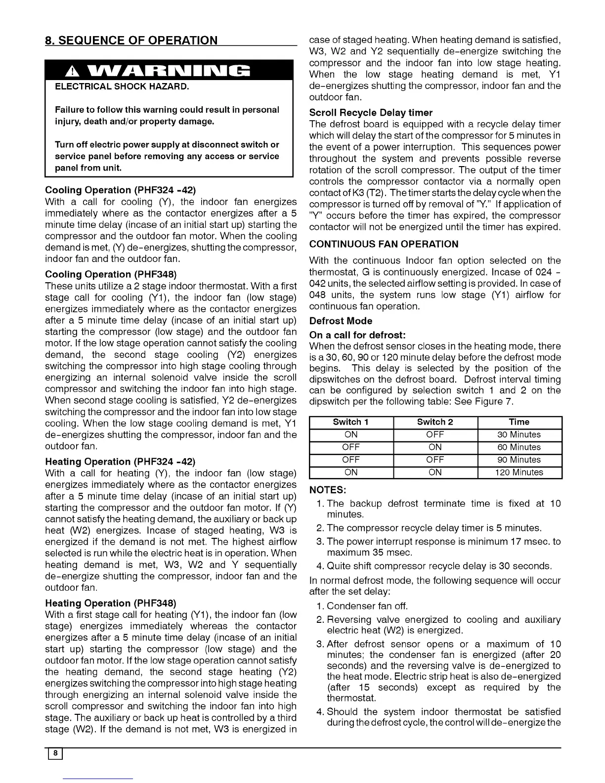 ICP PHF336000K00A1 - Sequence of Operation; Cooling Operation; Heating Operation; Scroll Recycle Delay Timer