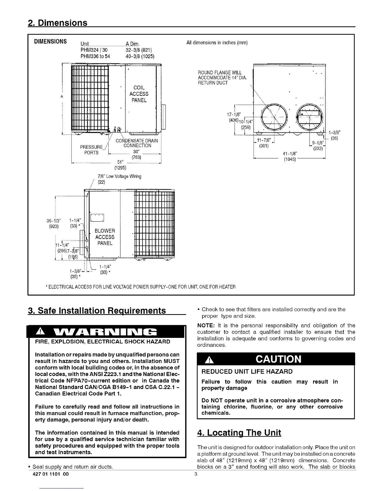 ICP PHM348K00A1 - Unit Dimensions; Safe Installation Requirements; Locating The Unit