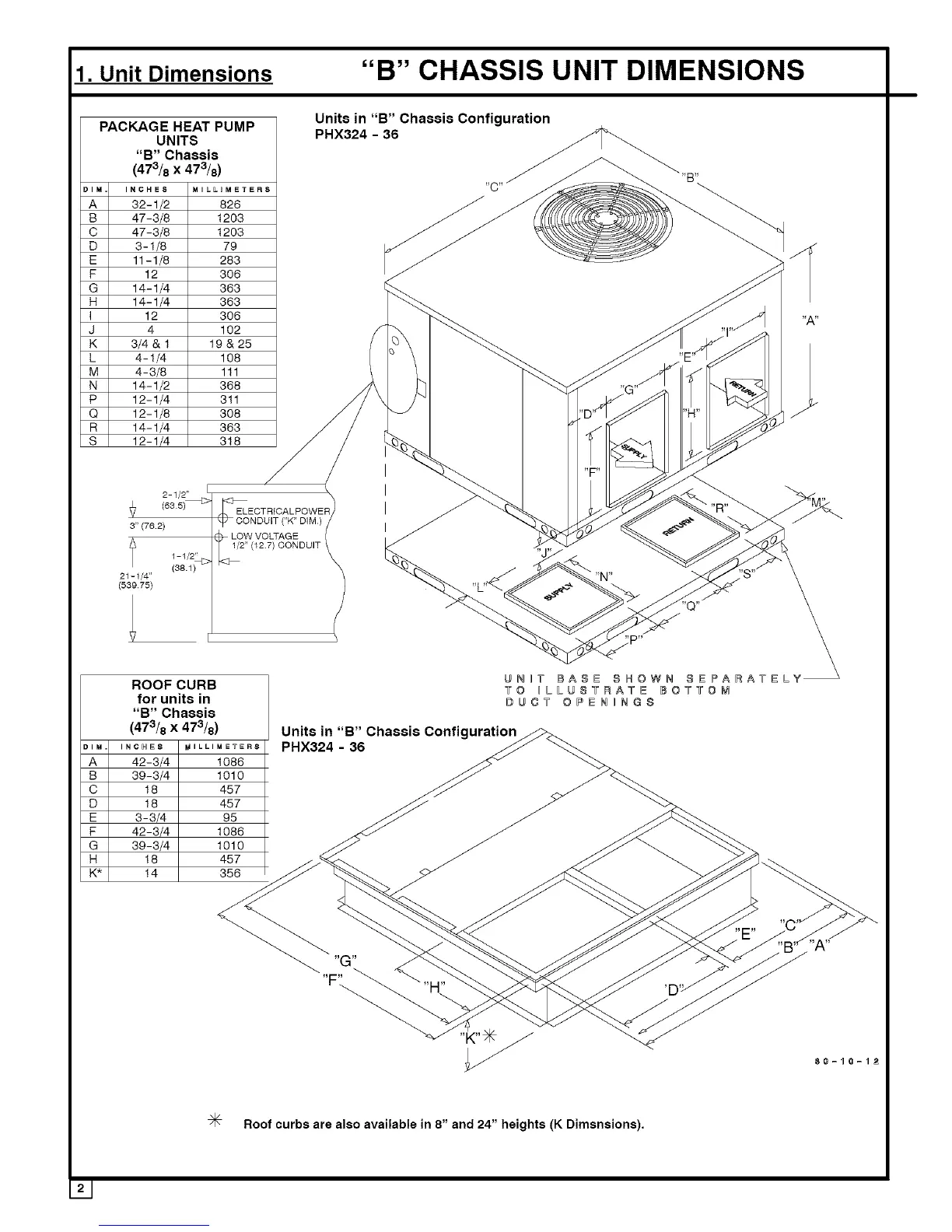 ICP PHX324000K00A1 - Unit Dimensions; B CHASSIS UNIT DIMENSIONS; ROOF CURB for units in B Chassis