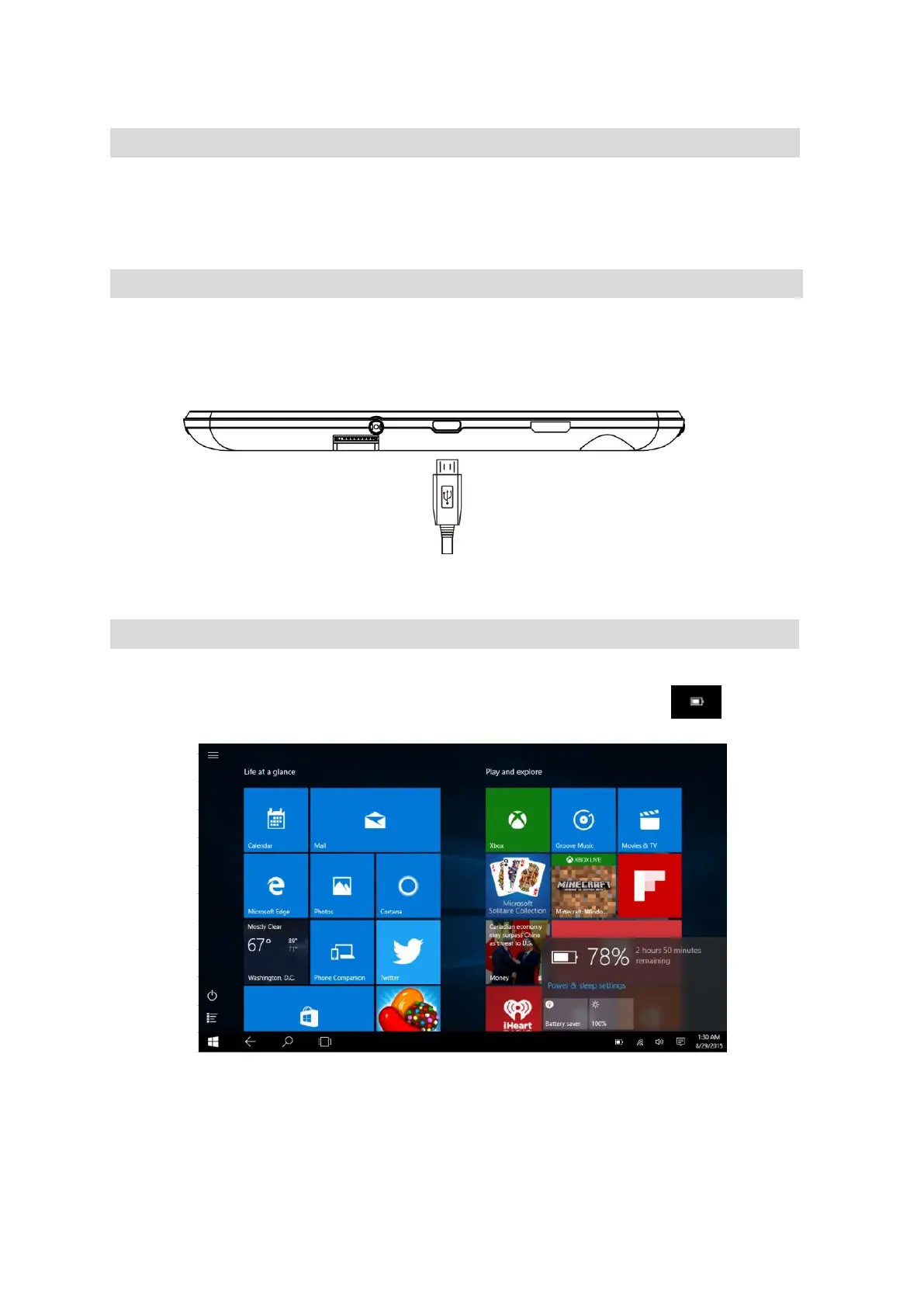 Use the included wall charger, the battery indicator on right top corner (near front camera) will