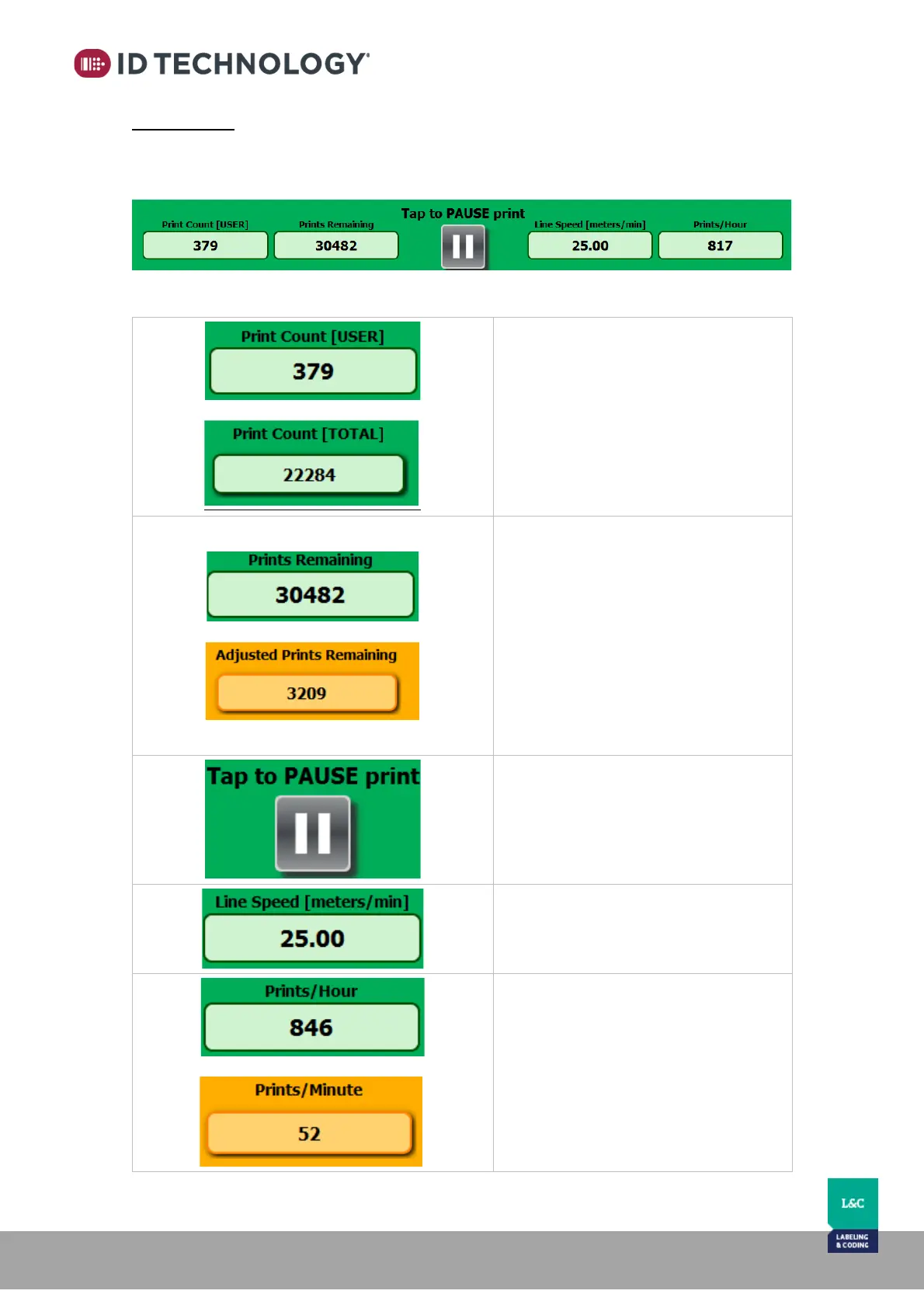This bar shows several numerical indicators for the printer, as well as the button for run and