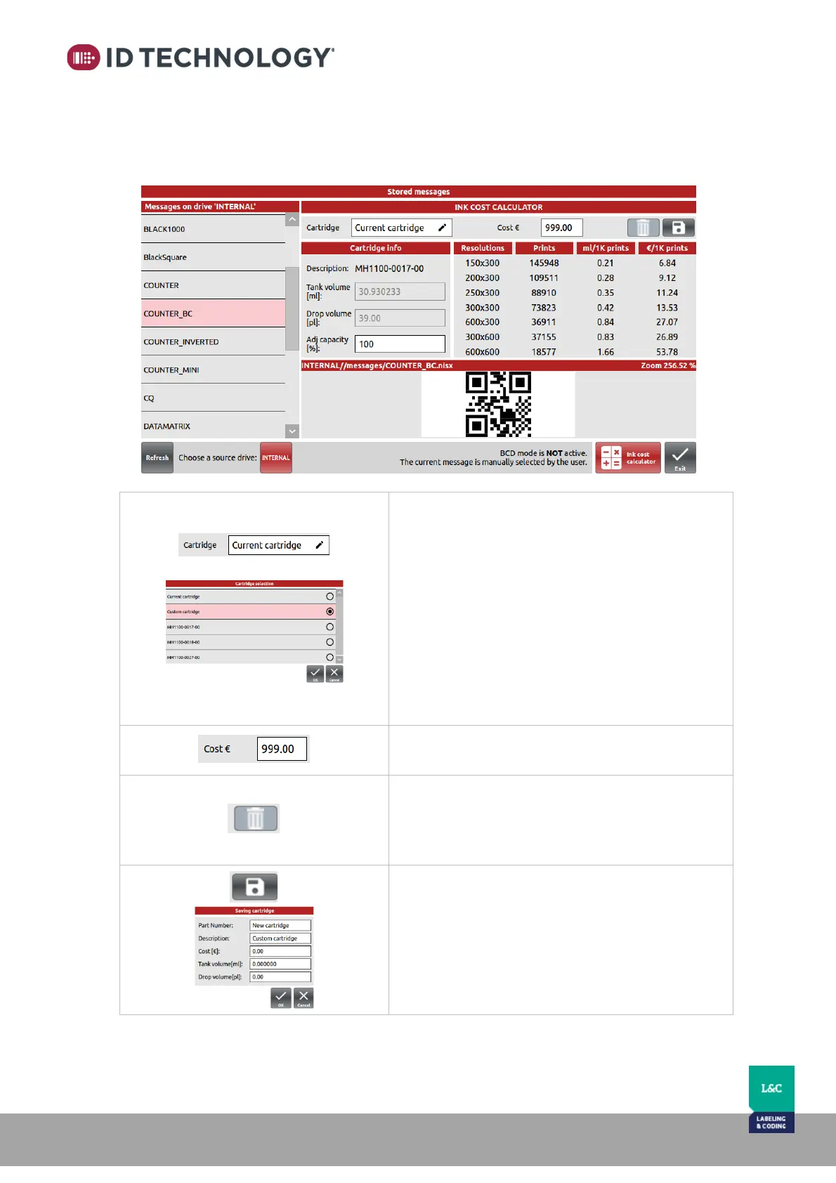 This tool provides the ability to calculate the ink usage and cost per print of a message depending
