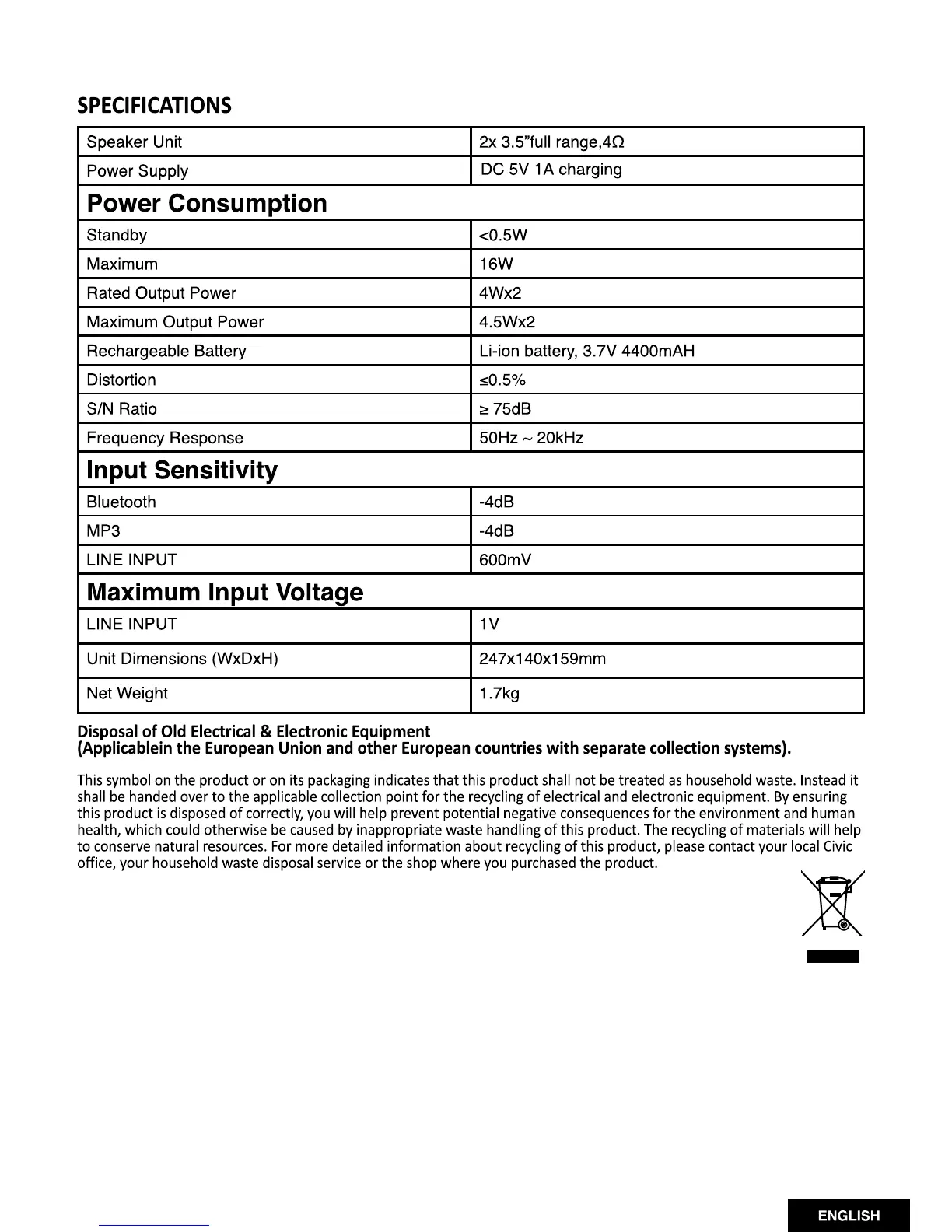 iDance ACDC CLASSIC 2 - Technical Specifications and Disposal; Disposal and Recycling Information