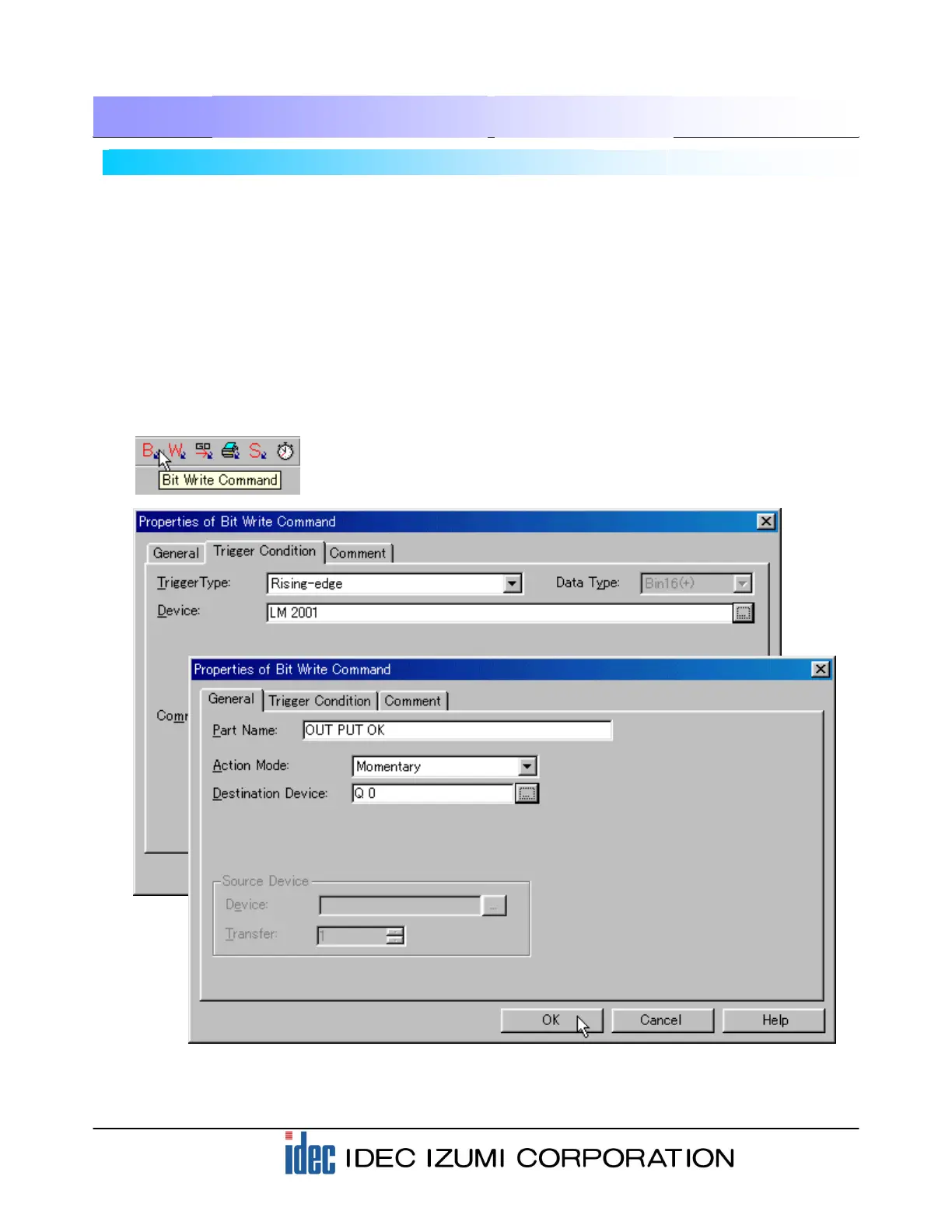 Example: Develop to the PLC output with “Bit Write Command” when the result is “OK”.