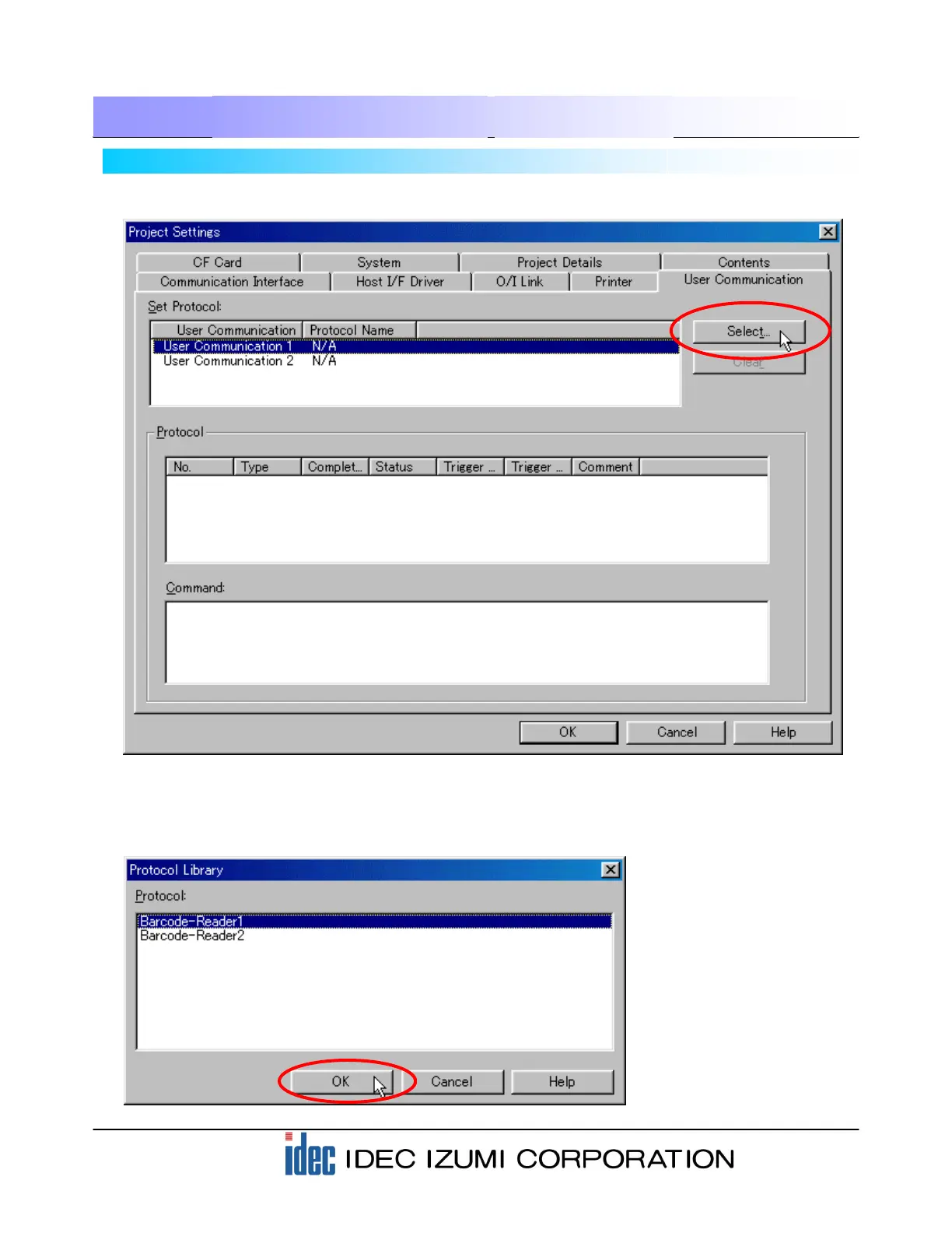 When the “Protocol Library” dialog box appears, select “Barcode-Reader 1” in the Protocol field, and then