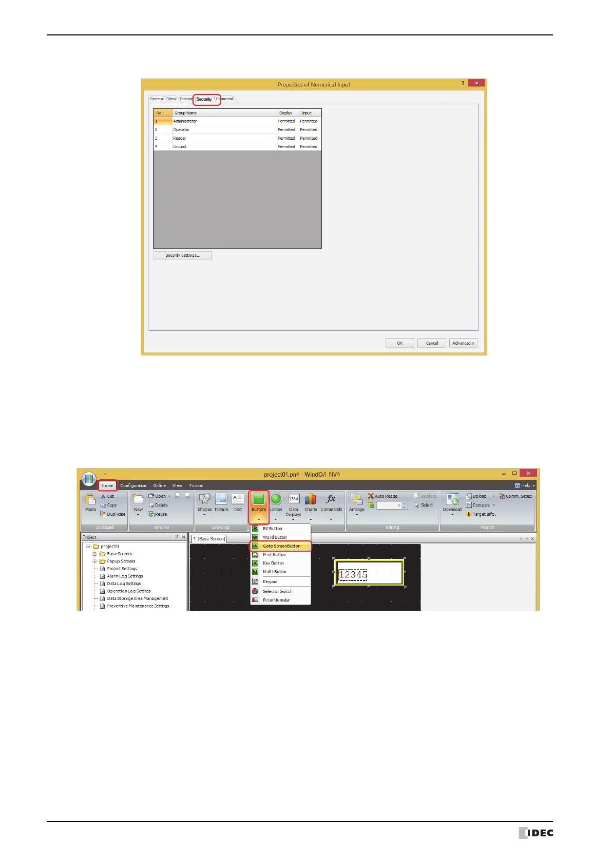 8 Place a Goto Screen Button to display the password screen on the base screen.