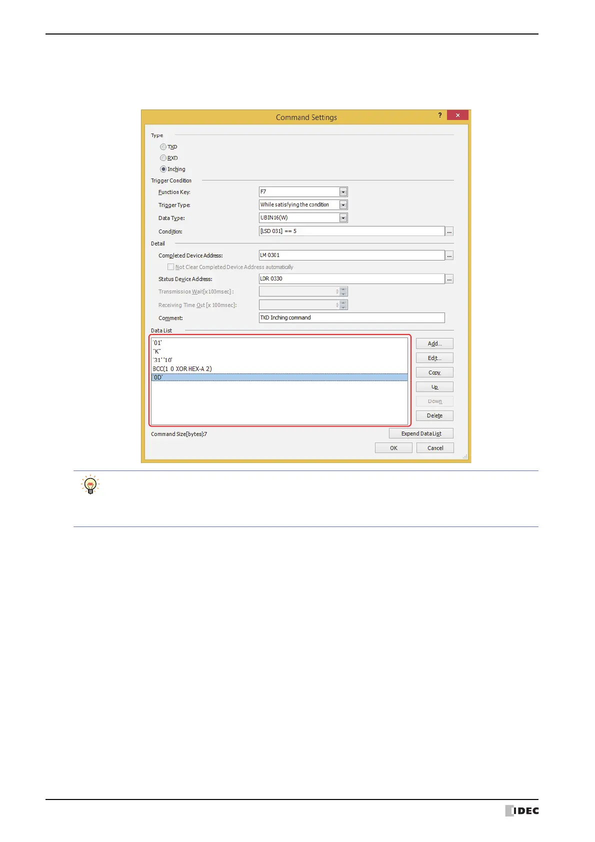 The command for the inching function configured in Command List and Data List on Project Settings dialog box is