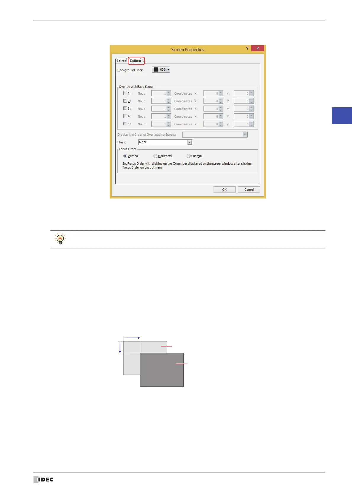 Coordinates X, Y: Specify the display location of the overlay screen in coordinates. The coordinates can be set