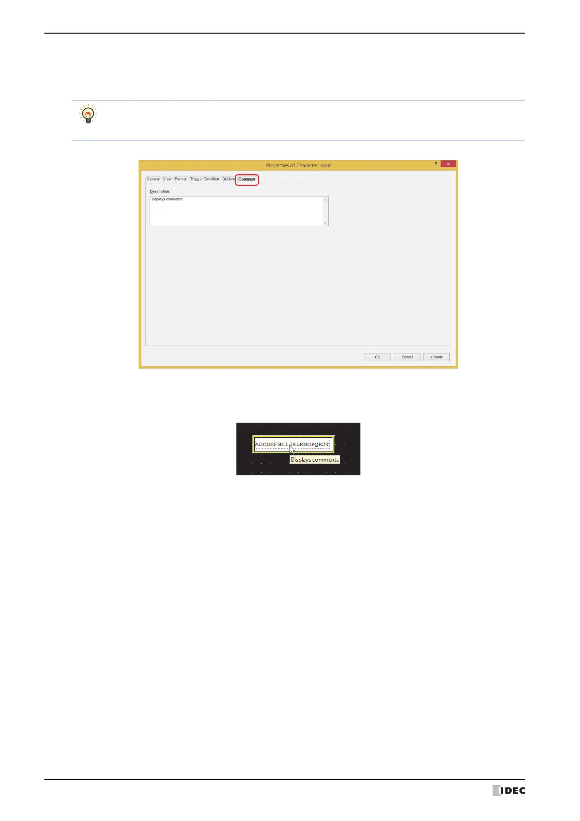 The Comment tab is used to specify the parts arranged on the editing screen, and the popup text displayed when