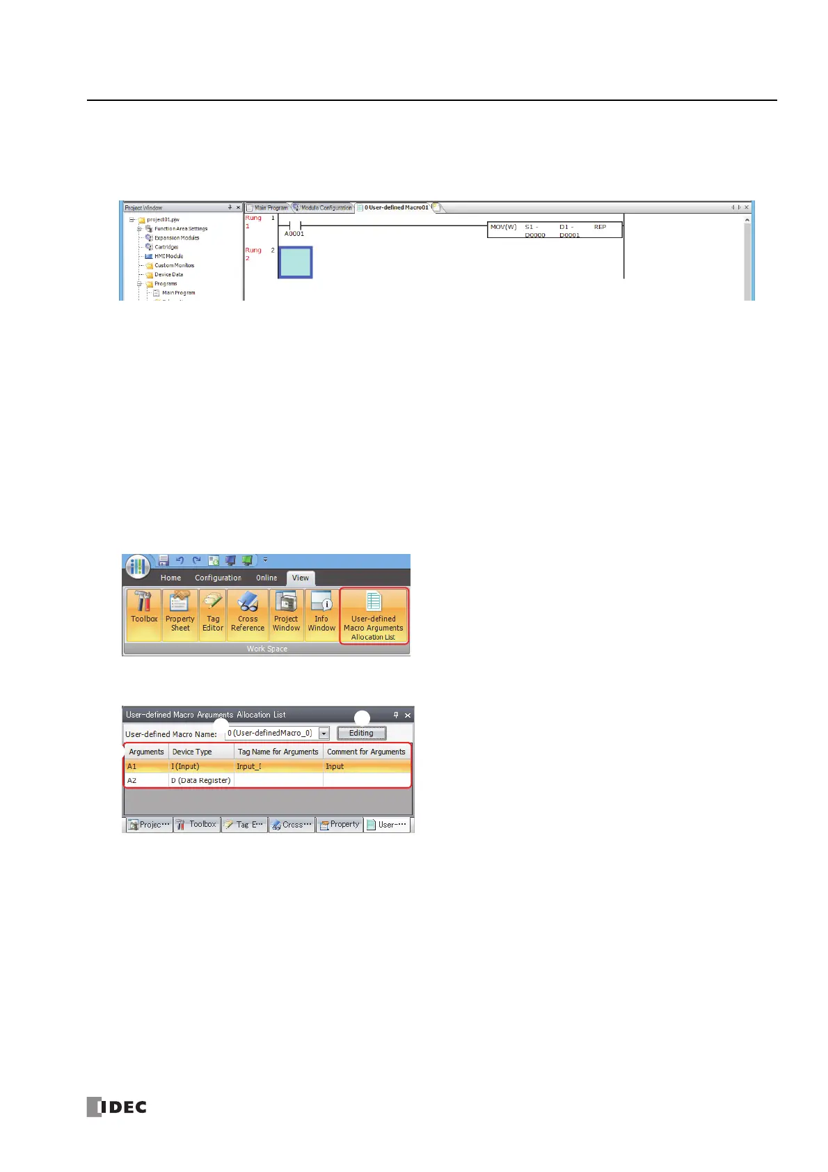 checked in the User-defined Macro Arguments Allocation List window and used in the ladder program as required.