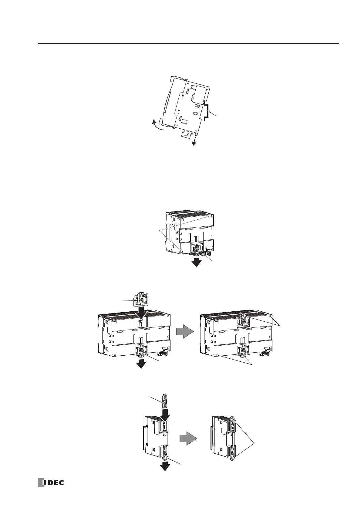 Pull out the DIN rail hook on the back of the module, attach the direct mounting hook (maintenance part: FC6A-PSP1PN05), and