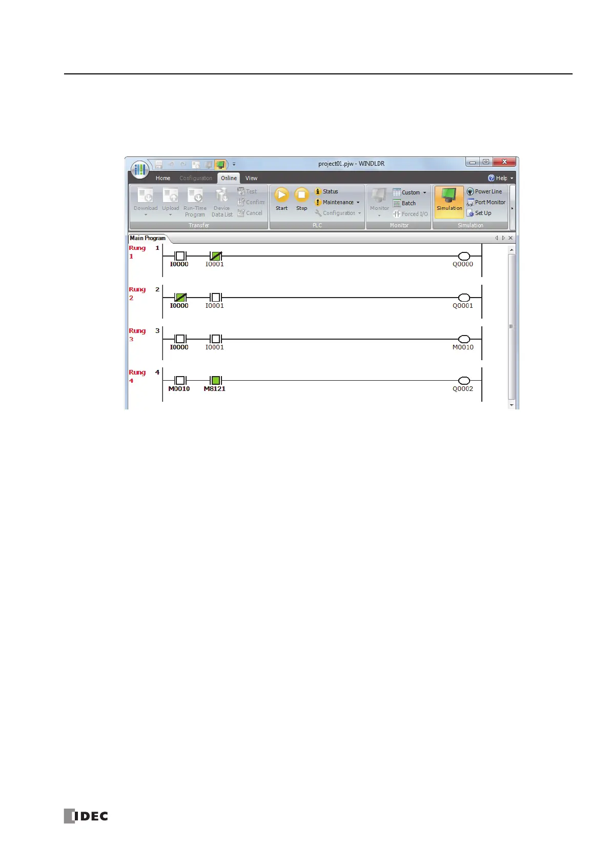 From the WindLDR menu bar, select Online > Simulation. The Simulation screen appears.