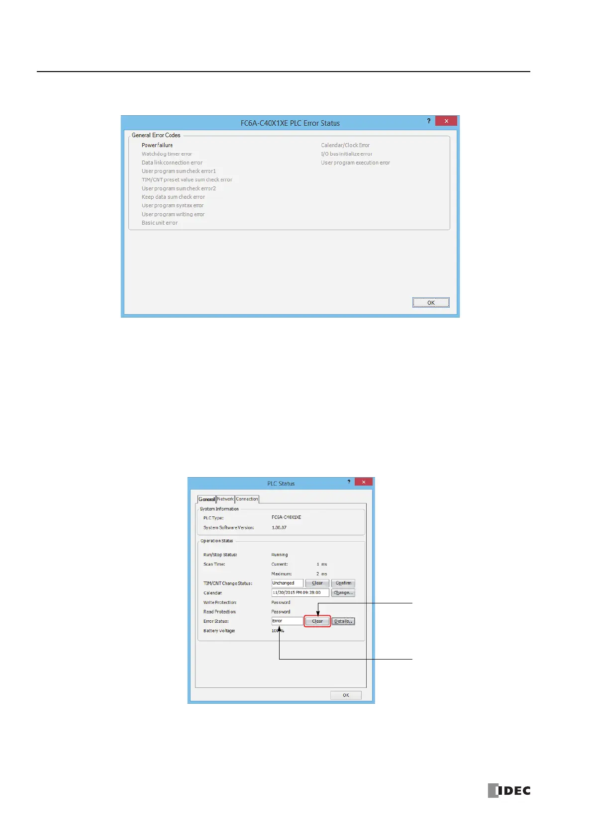 8. On the right of the Error Status in the PLC Status dialog box, click the Clear button.