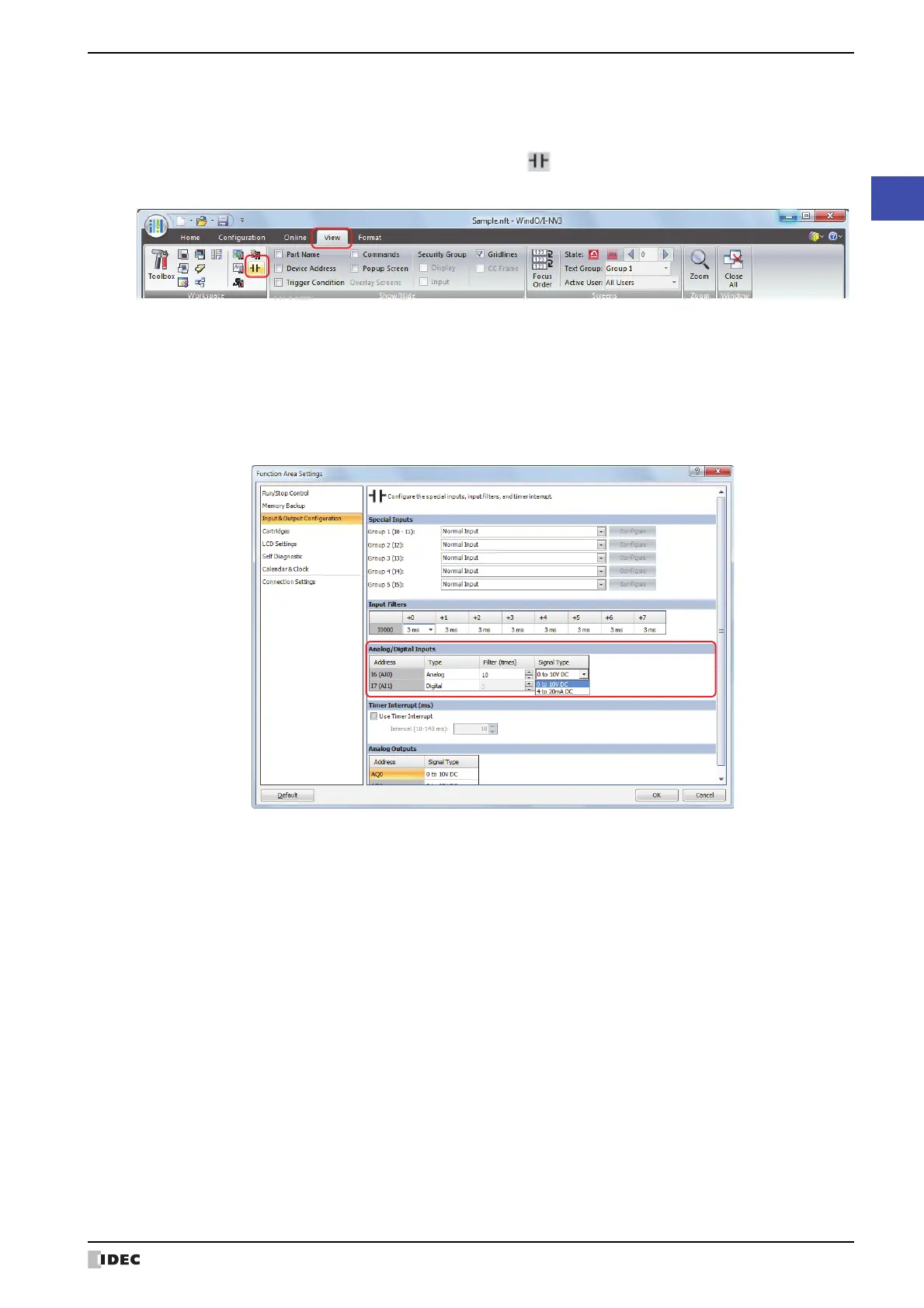 To use analog input, you must configure the Function Area Settings tab and download the ladder program or FBD