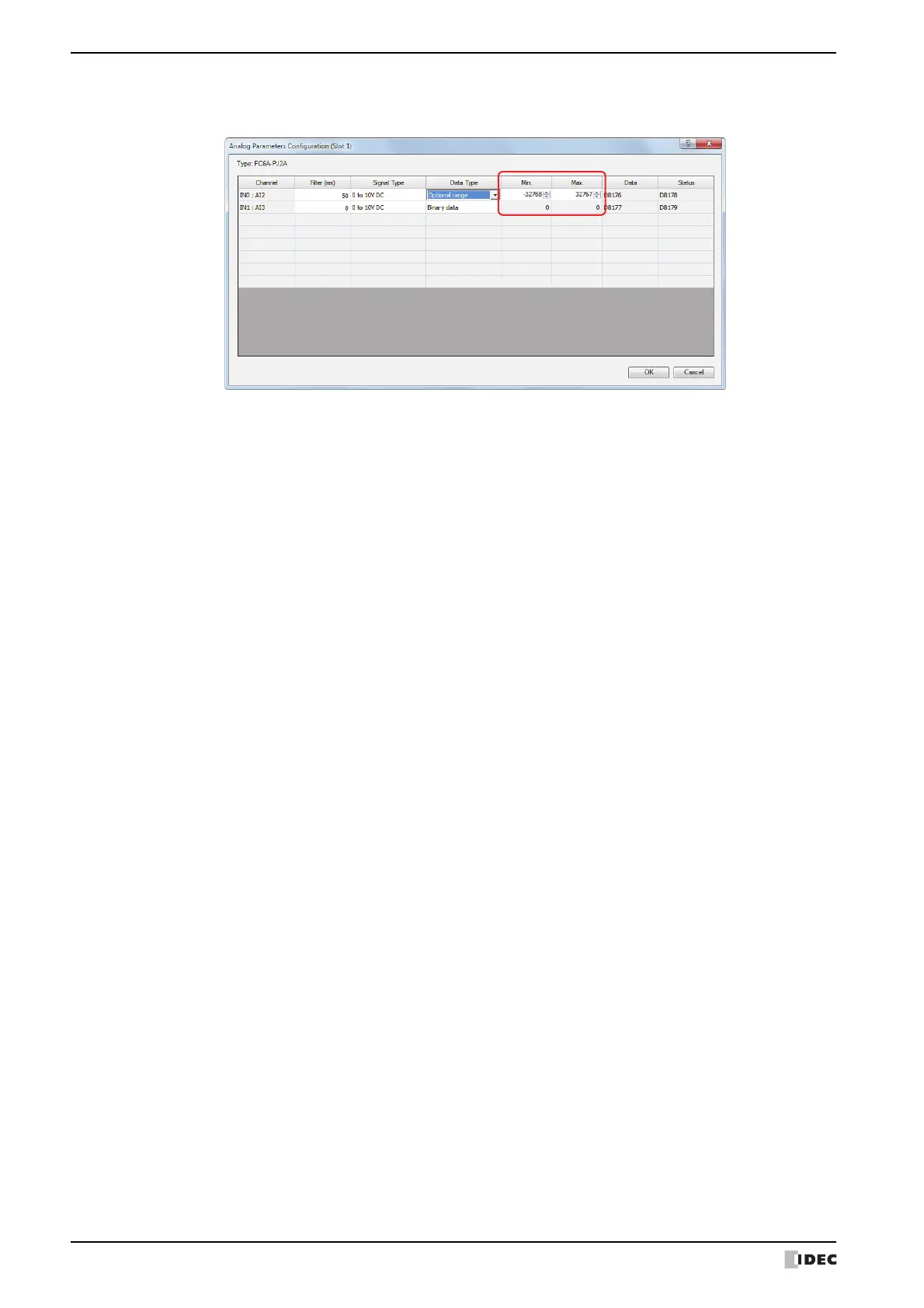 8 If Optional range is selected for Data Type, set the minimum and maximum of analog value for each channel in