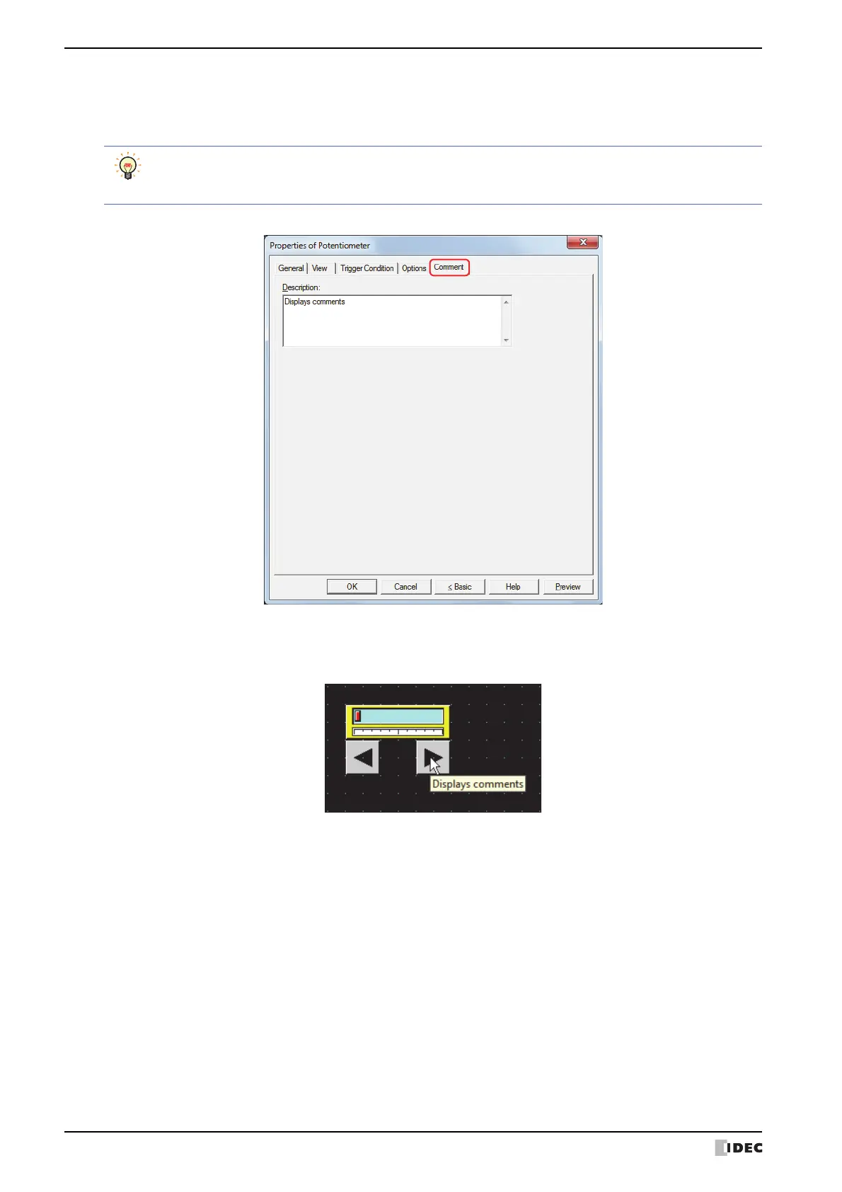 The Comment tab is used to specify the parts arranged on the editing screen, and the popup text displayed when