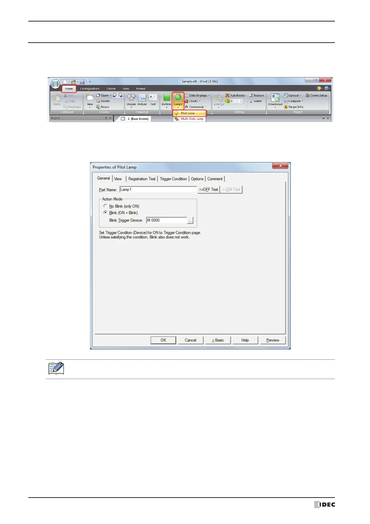 1 On the Home tab, in the Parts group, click Lamps, and then click Pilot Lamp.