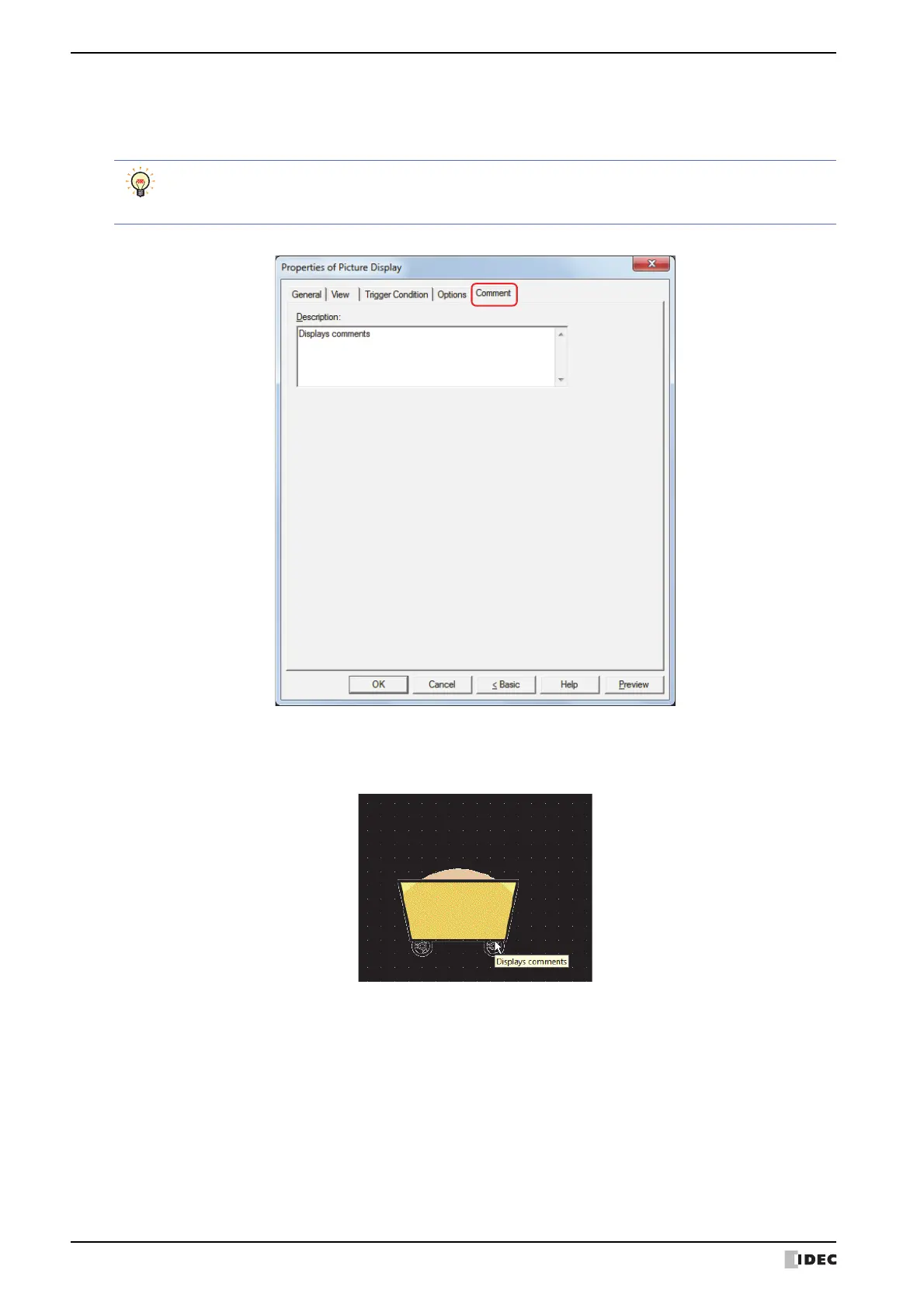 The Comment tab is used to specify the parts arranged on the editing screen, and the popup text displayed when