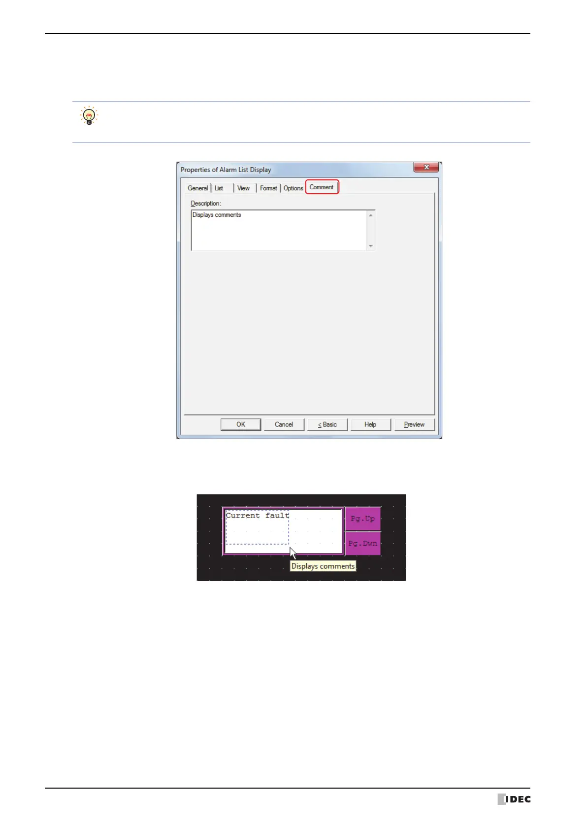 The Comment tab is used to specify the parts arranged on the editing screen, and the popup text displayed when