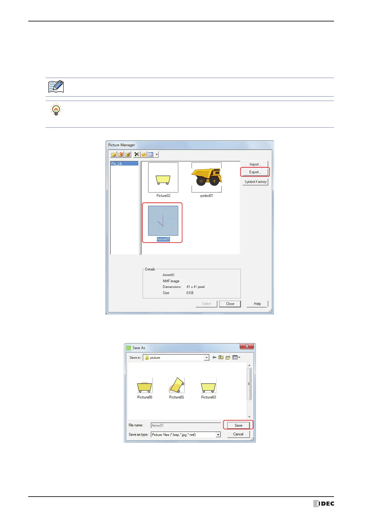 When Picture Manager is called from the Properties dialog box of an object arranged on the screen, Export