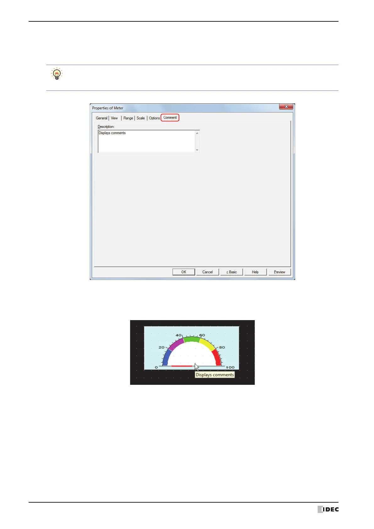 The Comment tab is used to specify the parts arranged on the editing screen, and the popup text displayed when