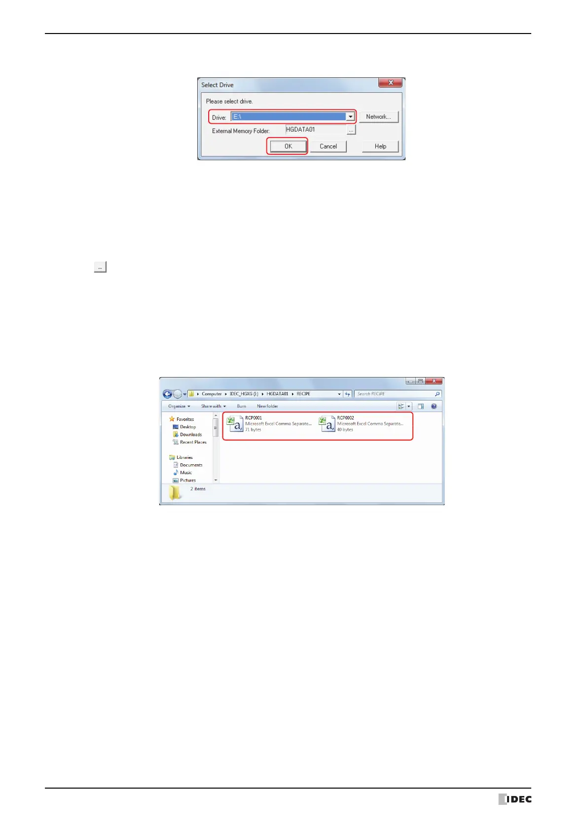 The “RECIPE” folder is created in the External Memory Folder used as the save destination, and the recipe files for the