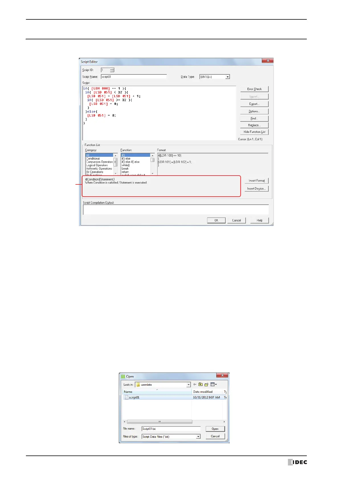 By selecting a script saved (exported) in a text format (*.txt) and clicking Open, the imported script is inserted at the