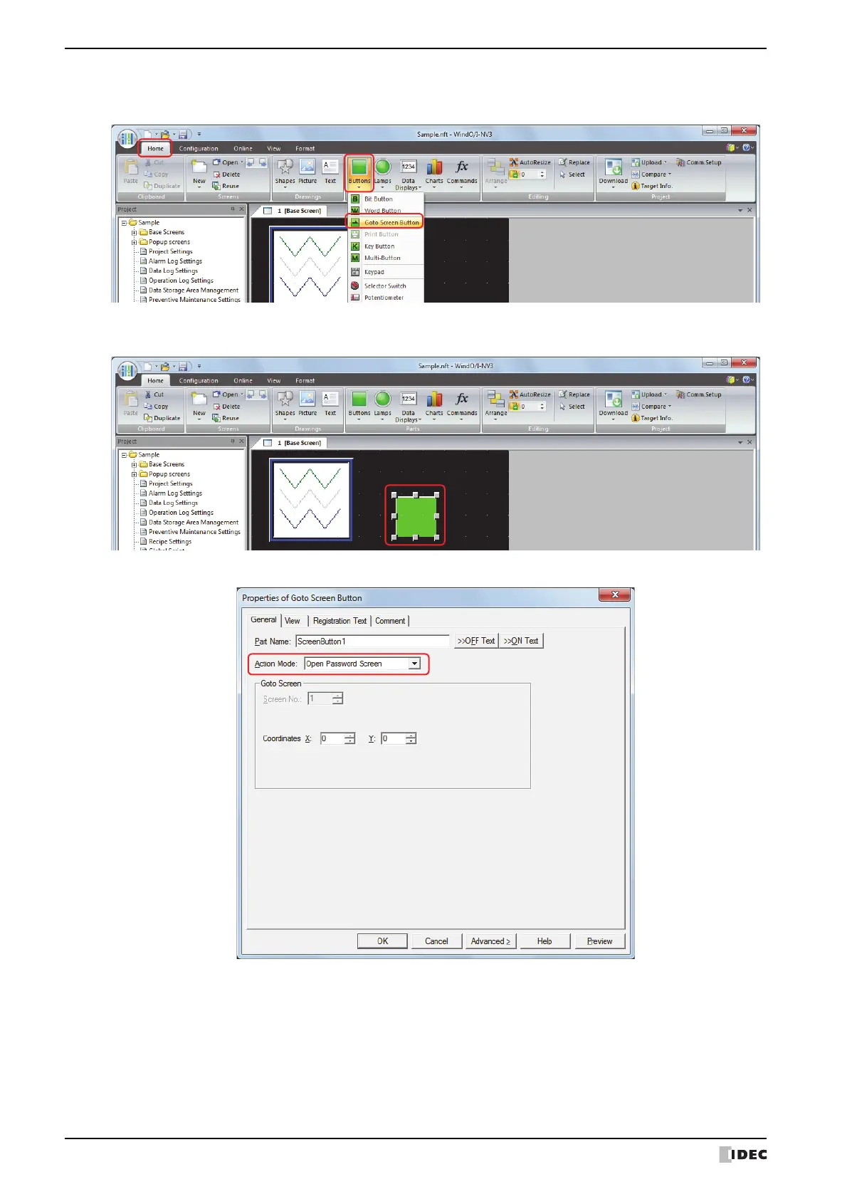 9 Place a Goto Screen Button to display the password screen on the Base Screen.