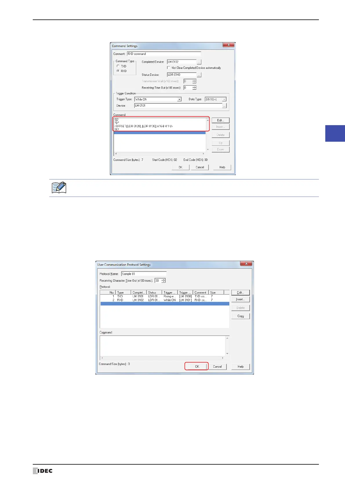 The receive command configured in Protocol on the User Communication Protocol Settings dialog box is displayed.