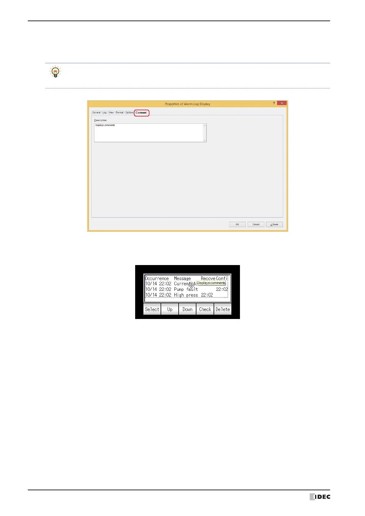 The Comment tab is used to specify the parts placed on the editing screen, and the popup text displayed when the