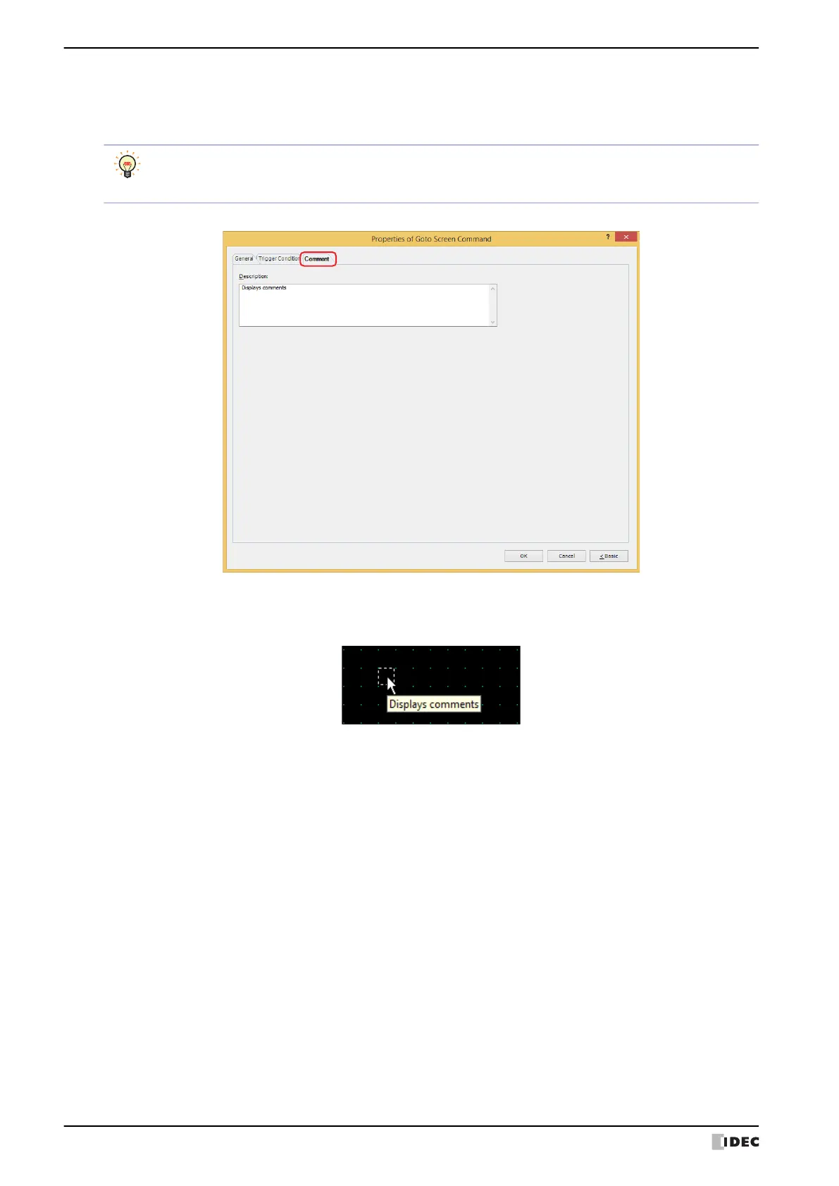 The Comment tab is used to specify the parts placed on the editing screen, and the popup text displayed when the