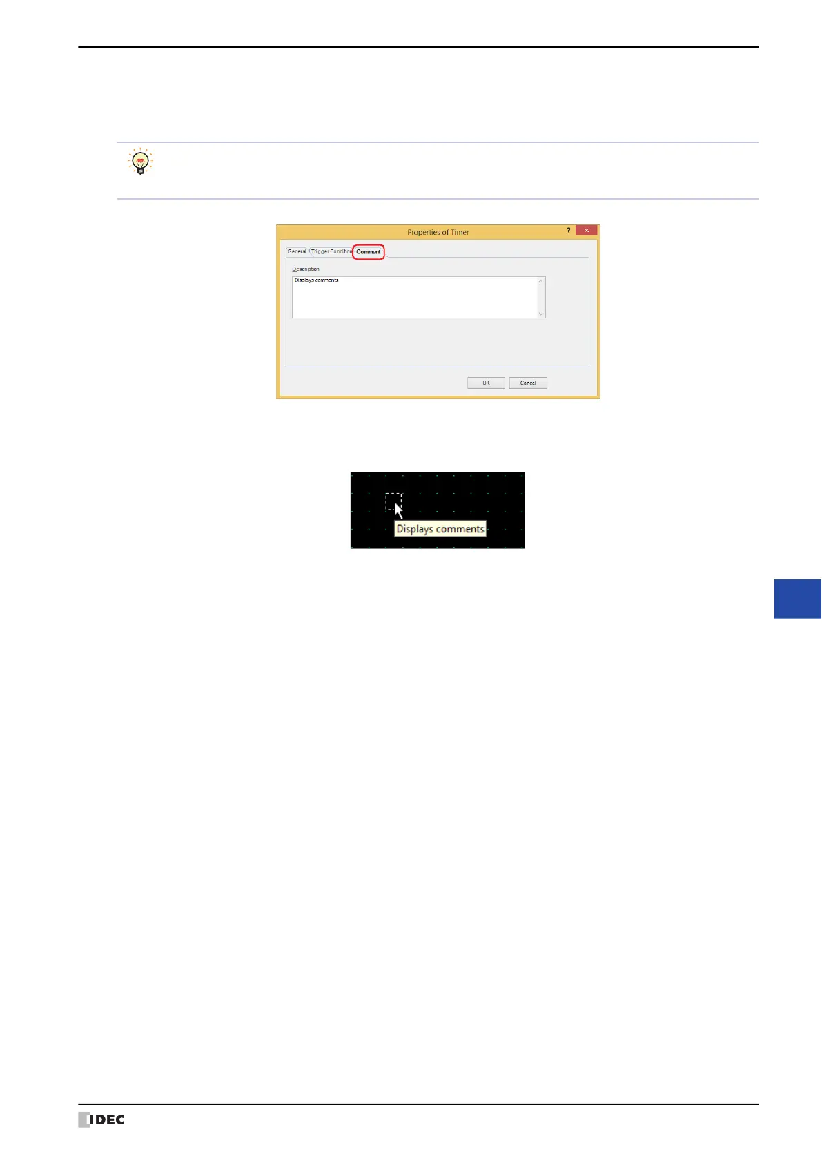 The Comment tab is used to specify the parts placed on the editing screen, and the popup text displayed when the