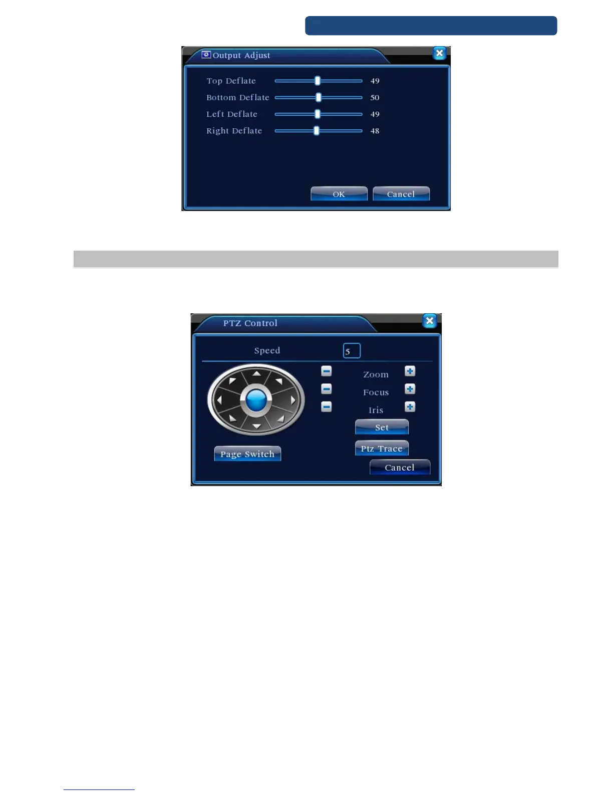 Operation interface is as followed. The functions include: PTZ direction control, step, zoom, focus, iris, setup