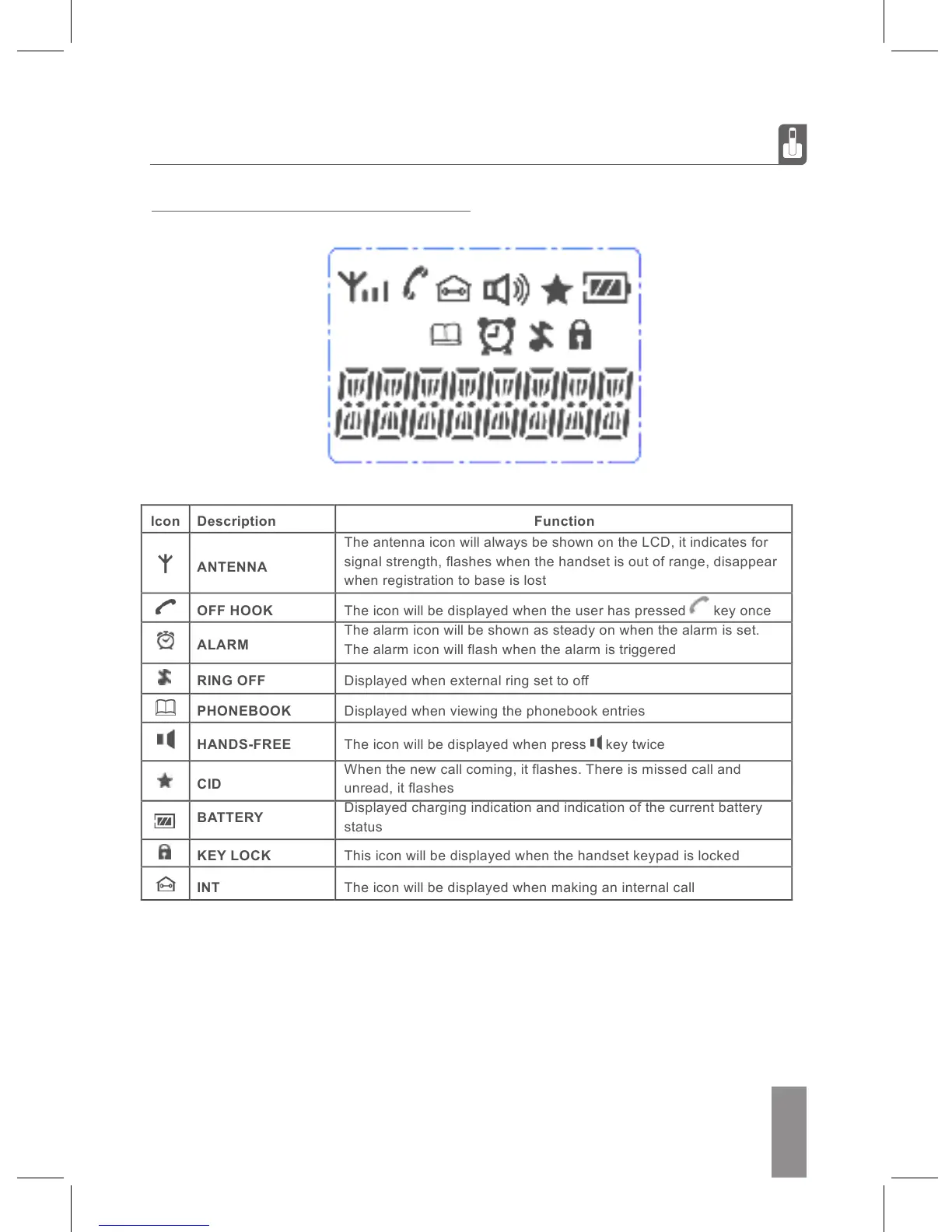KEY LOCK This icon will be displayed when the handset keypad is locked