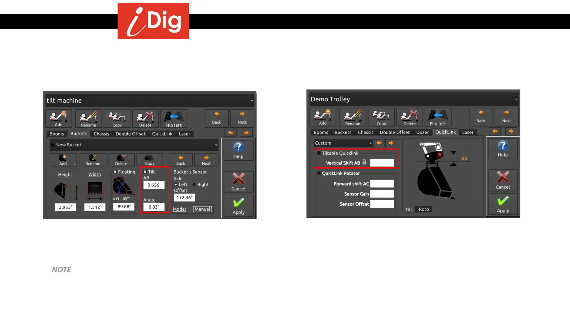NOTE To redo the calibration of this bucket, remove the corresponding tilt calibration by un-checking the “Tilt” box. Then you can re-