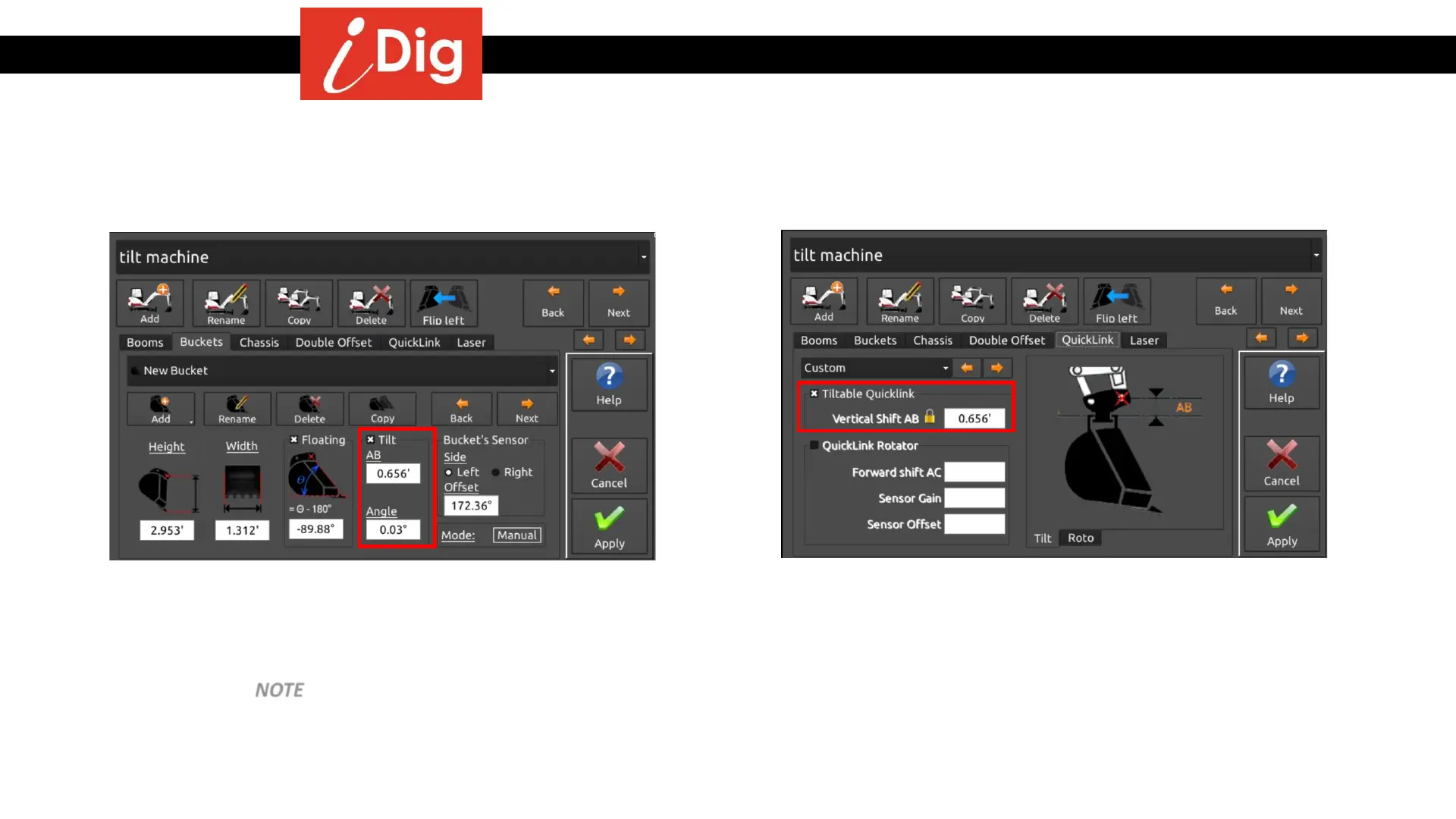 NOTE By un-checking the “Tiltable Quicklink” box option you’ll remove the tilt calibration for all buckets.