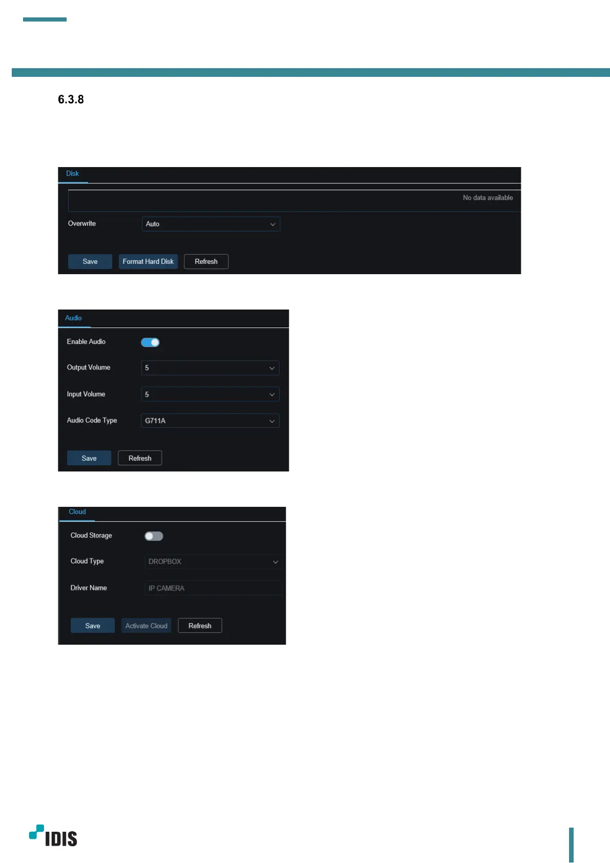 Idis DC-D4511WERX - Device Settings; Disk Settings Management; Audio Settings Configuration; Cloud Settings Configuration