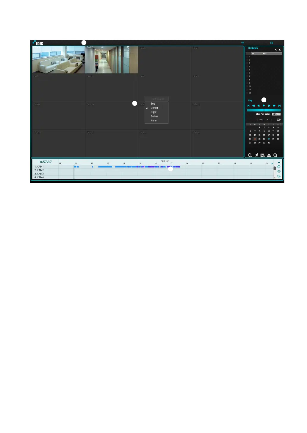 3 Right: Activates the control buttons on the right. Use the arrow buttons to select Bookmark, Play, Calendar