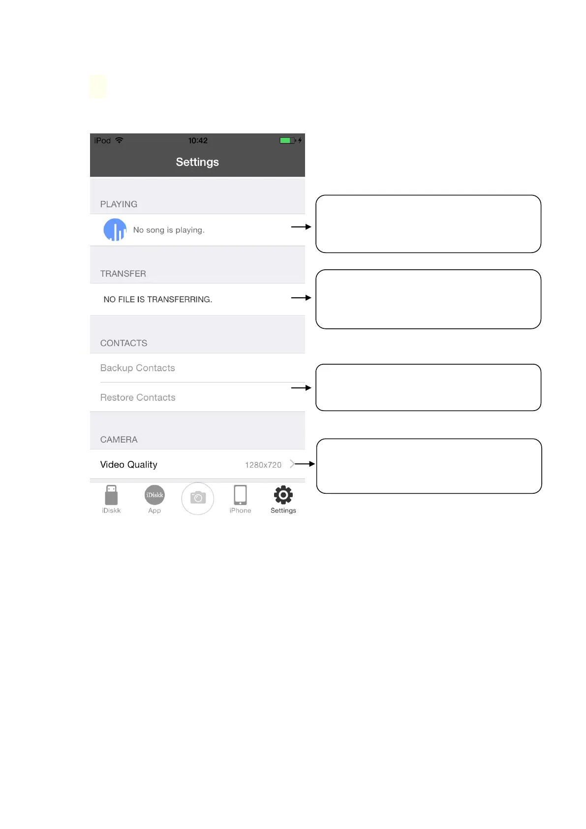 iDiskk mini - iDiskk Settings and Configuration; Player and Transfer Status Indicators; Contacts Backup and Video Quality