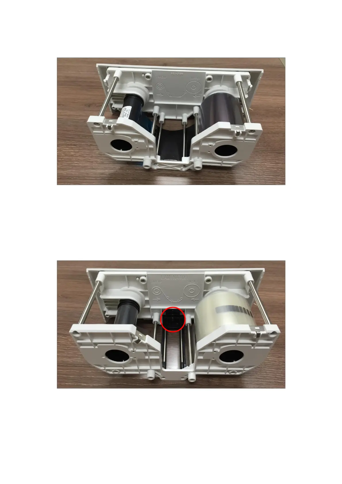 of film cartridge as figure. If vertical laminating position on card is needed to adjust, please use