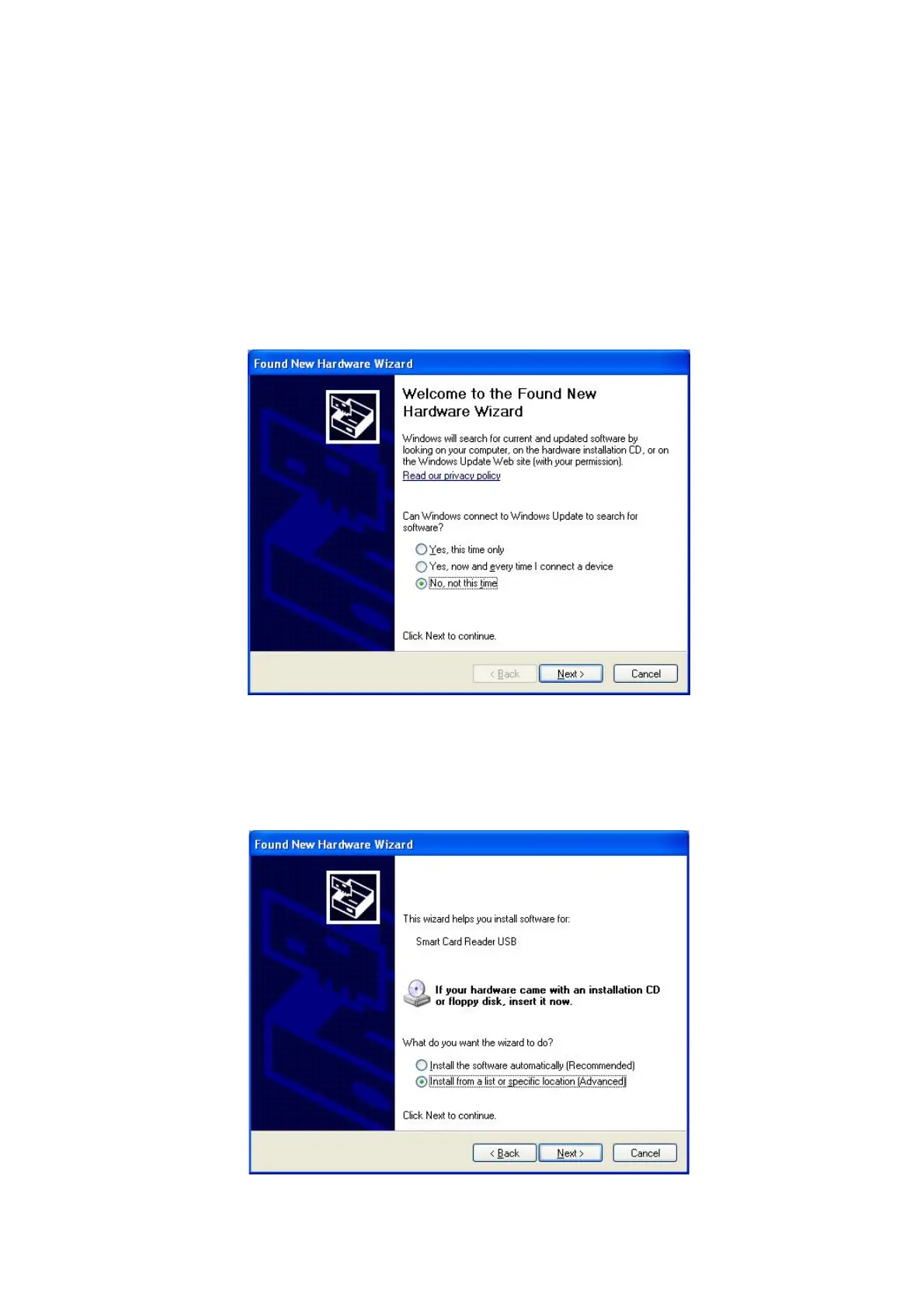 Hardware Wizard” as the picture, then Check “No, not that time” and Click “Next” to continue.