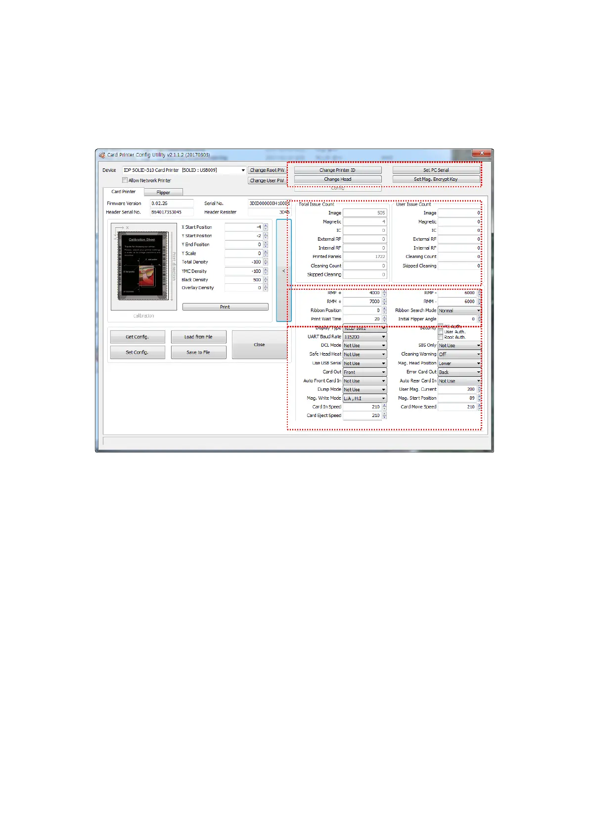 ① You can set Printer ID, PC serial, Print head and Magnetic encryption key.