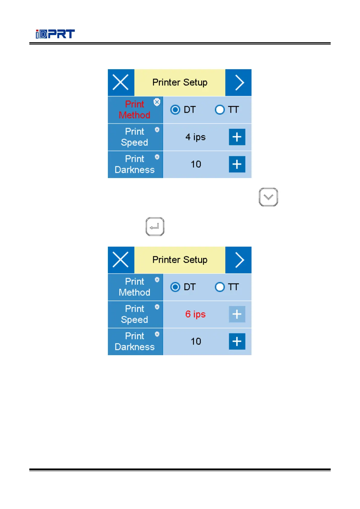 5.Move the selection highlight to “Print Speed” item by down arrow button . Then change it