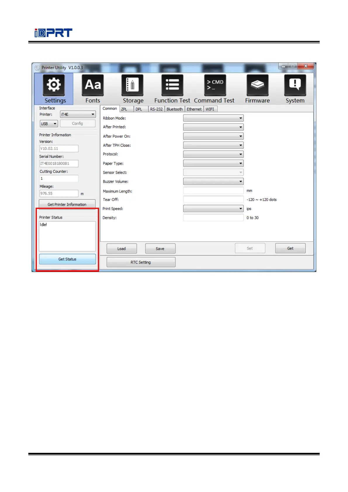 (3) Click “Get Status”, and printer status will show in the above.