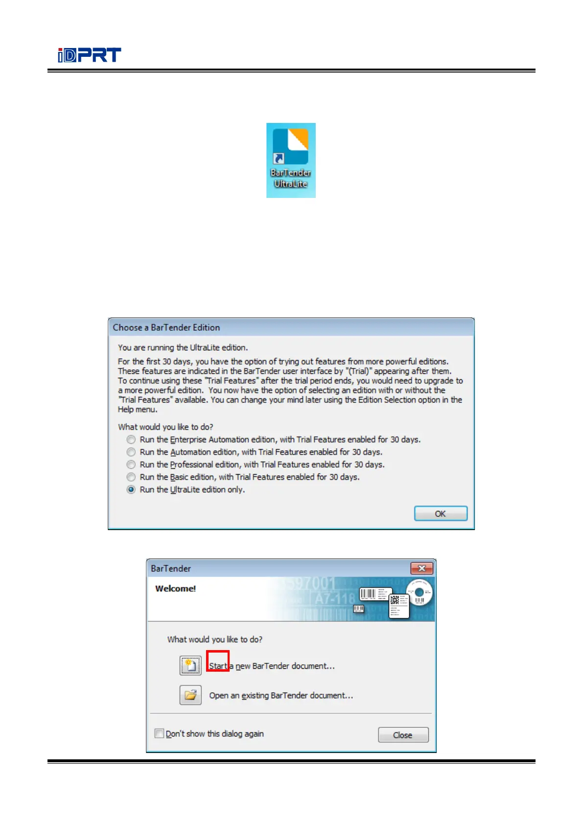 2.Click “Start a new BarTender document.